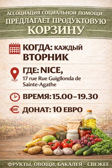 Наша ассоциация зарегистрирована в указе префекта региона PACA от 1 декабря 2024 года, а затем в обновлённом указе от 1 декабря 2025 года как ассоциация, уполномоченная распределять продовольственную помощь в городе Ницца на благо людей, оказавшихся в крайне нестабильных ситуациях.